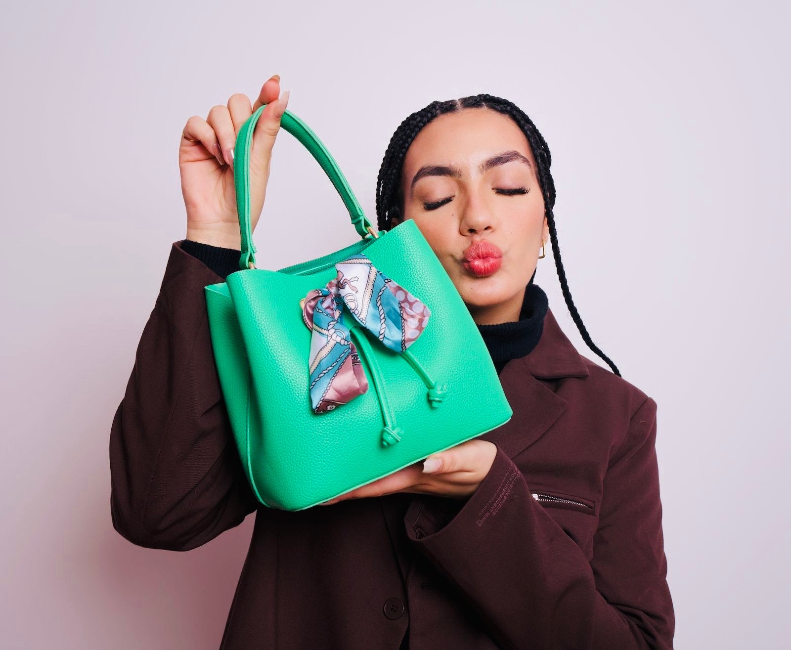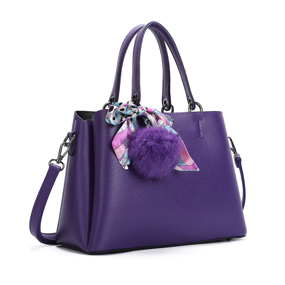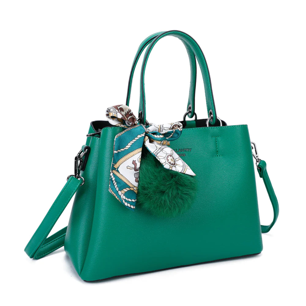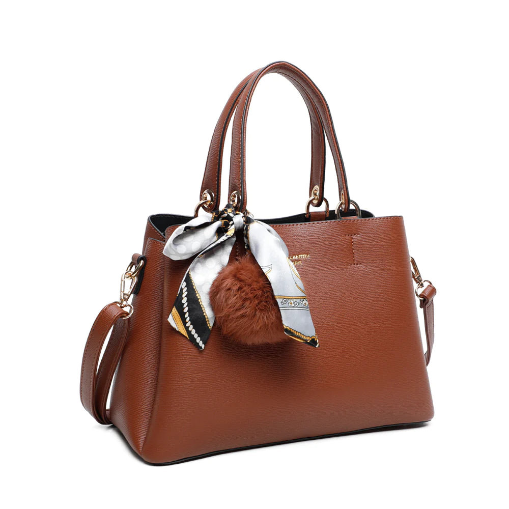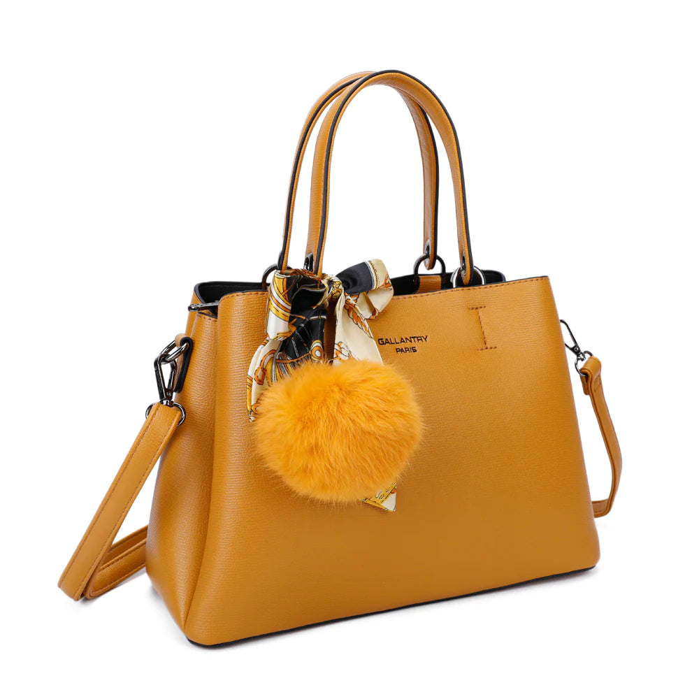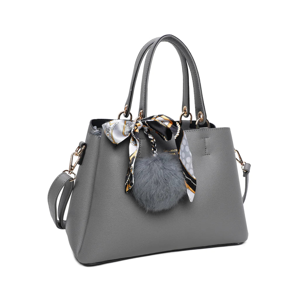 Coquette™ by Gallantry is a handbag that combines elegance and functionality. Its structured silhouette and refined details, such as a faux fur pompom and a fabric scarf, add a touch of femininity and color to your outfit.