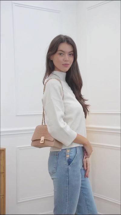 Les dimensions du sac sont de 22 x 8 x 15 cm, avec un poids de 0,51 kg, ce qui le rend pratique et facile à transporter. Sa silhouette structurée et ses bords arrondis lui donnent une allure raffinée, tandis que la texture en simili-cuir croco ajoute une dimension tactile et visuelle.
